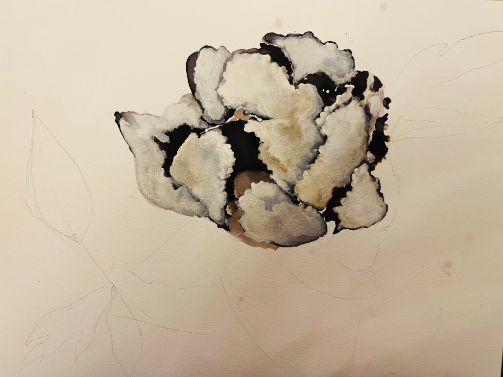 Below is another sketch of peony flower. I used black ink and white acquarelle paint in the tube, it is thick and convenient to use, it works well with inks. I did two versions: one is more black and another one is more white, I painted white layers on top of the black ink. I didn’t like both of them. The peony ended up looking as a cauliflower.