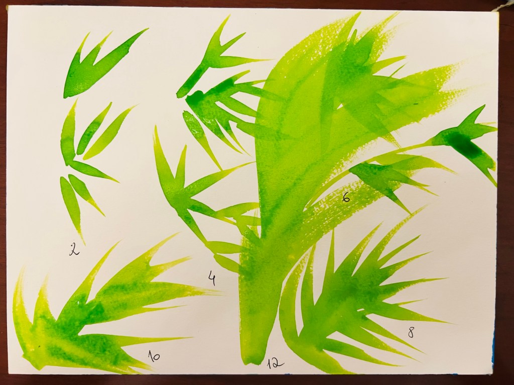 Below is my continuation of testing inks and green shades for the plants’ (probably irises’) stems.