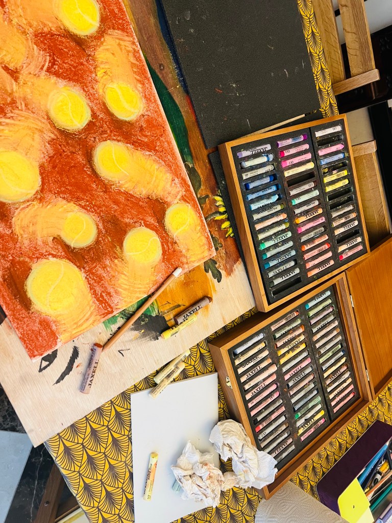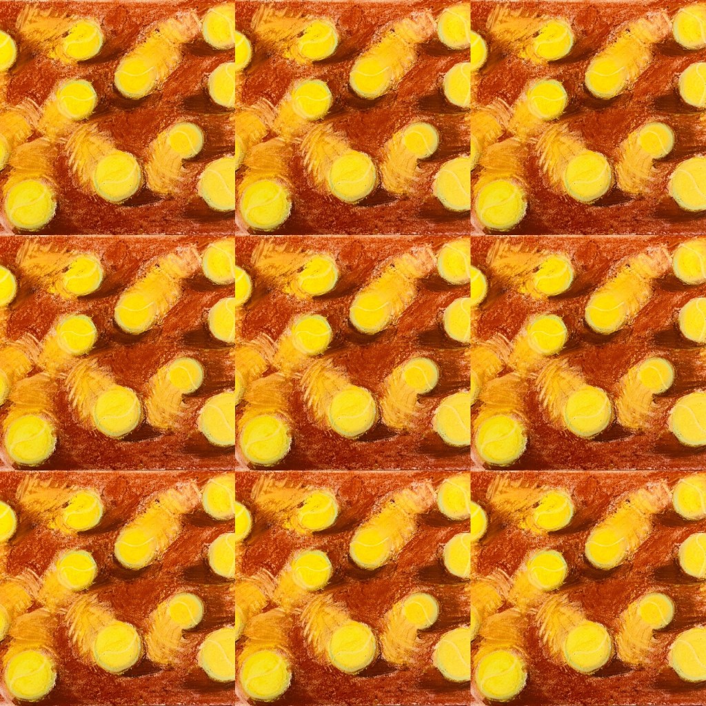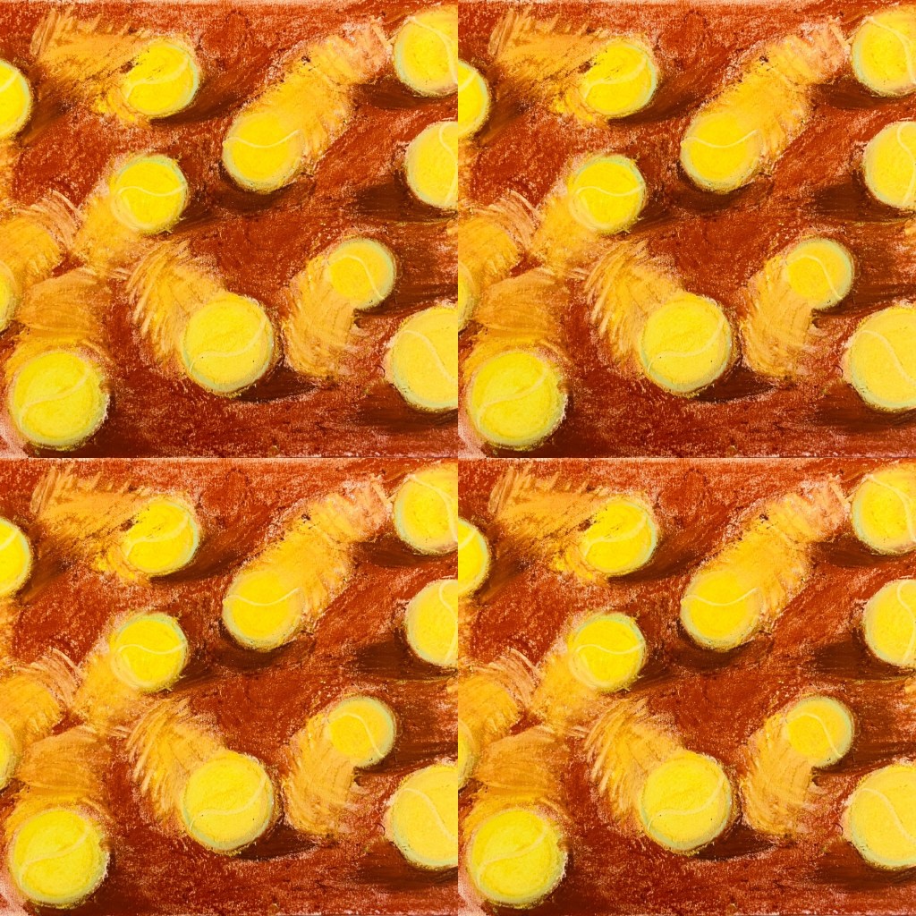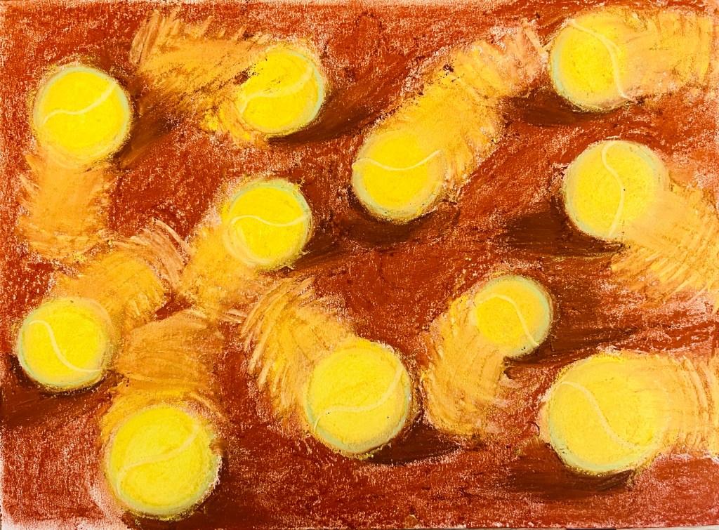 I have been always super intrigued by the movement of the tennis ball during the game. So I tried to study its motion. Tennis balls’ moves on the tennis court are chaotic and random. I tried to convey the sensation of tennis ball’s movement through drawing yellow “tales” in thick streaks behind each ball and shadowing the spot of their impact on the tennis court’s surface. I worked with soft pastel sticks which contain prefect colour for the clay tennis court surface and the bright yellow tennis ball.