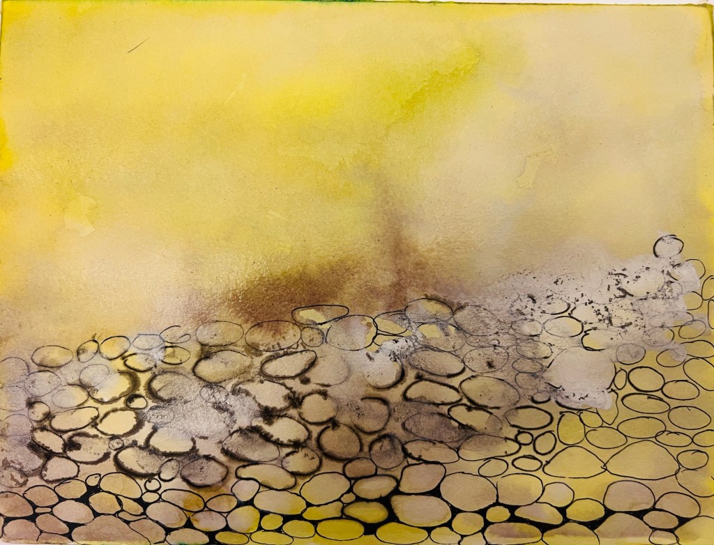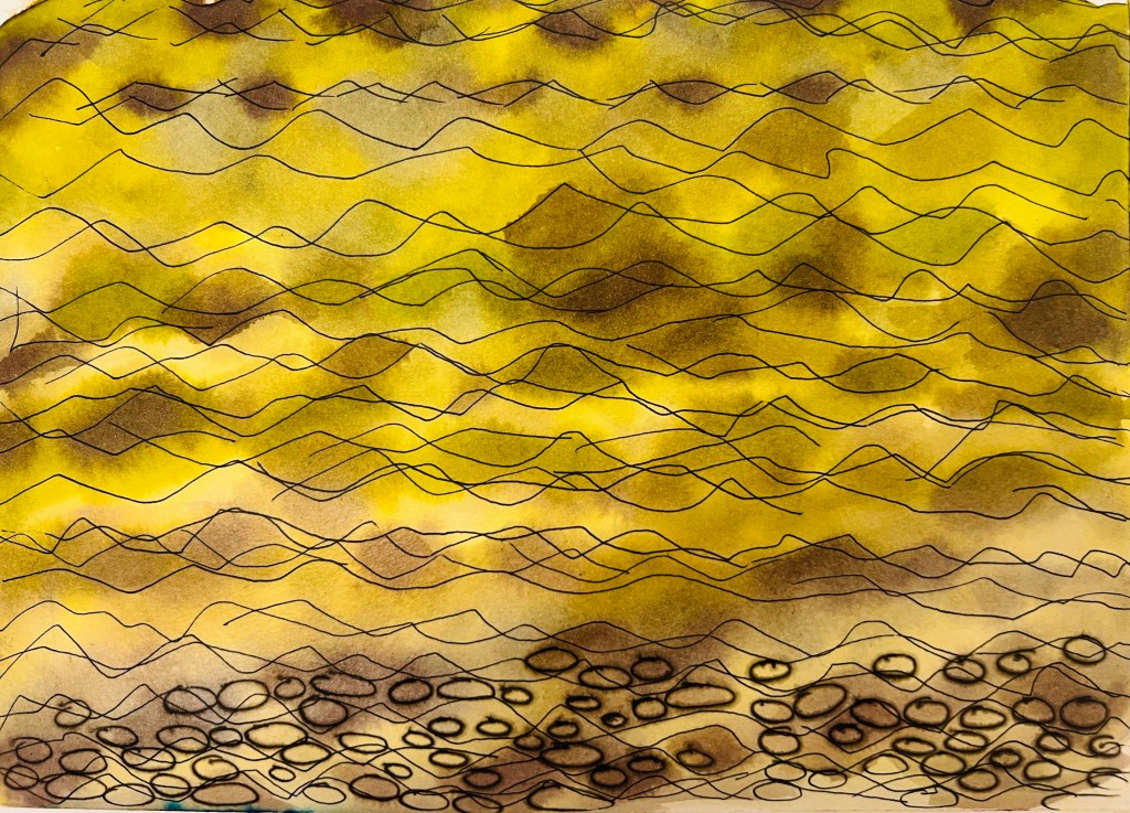 The drawings above and below are about water and pebbles. When I was observing sea water and the pebbles under it, I noticed that because of water’s constant movement you can’t see all the pebbles at once simultaneously. So I made some pebbles clearly visible and some of them – not, applying some white layer on top and working with black ink pen on wet surface to make the edges loose. The drawing below is a further development, an alternative water movement, which I did tracking the small numerous waves of moving water and adding more dark brown pigment ink on the surface to indicate the shadows which appear constantly in different places of the moving water surface. These drawings contain lots of information, because the subject is more complex. If we compare the moving air/wind and the moving water we clearly see that the water is much more complex subject by its nature, it has more material substance to work on.