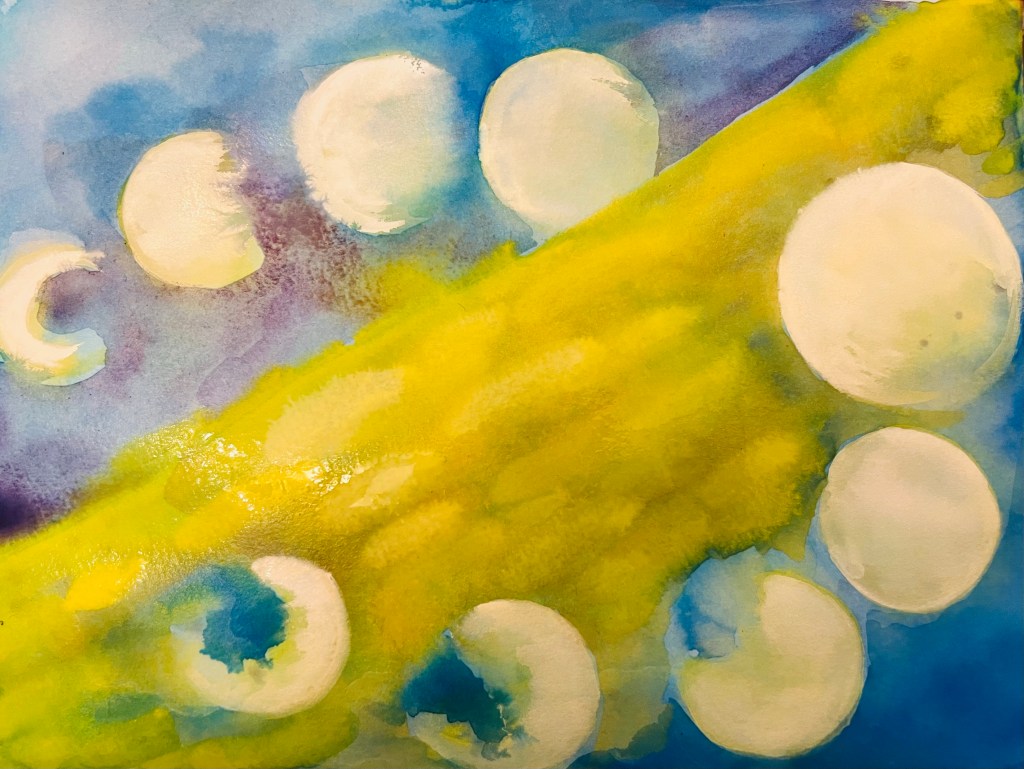 On the drawing below I added the thick streak of yellow Sun ray. You can see inside this wide ray thick brushstrokes which indicates the movement of cosmic energy, the same is about the overall negative space and the blue background: I made it uneven and complex, to out line the idea of constant change in Cosmos and constant move of powerful cosmic forces. My Moon goes through the Sun beam what also increases the effect of their Cosmic unity they constantly undergo. This drawing also contain s lots of information and I like that. That makes interesting to gaze at the drawing and gives it some visual power.