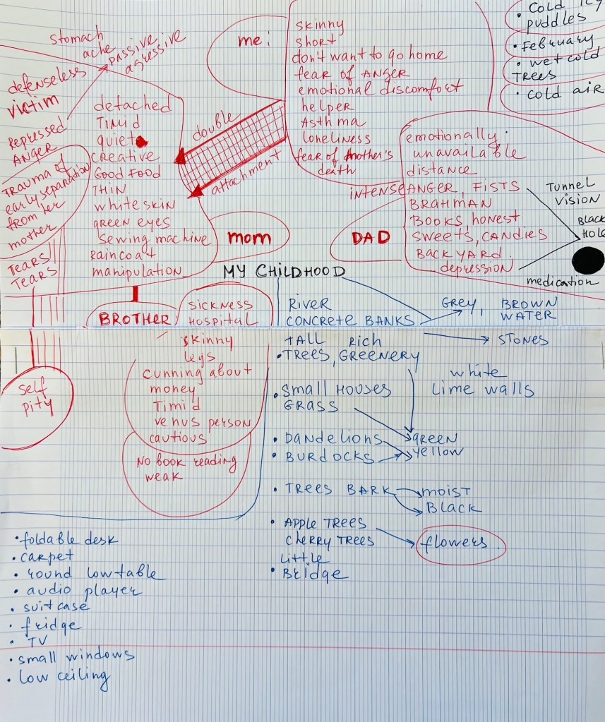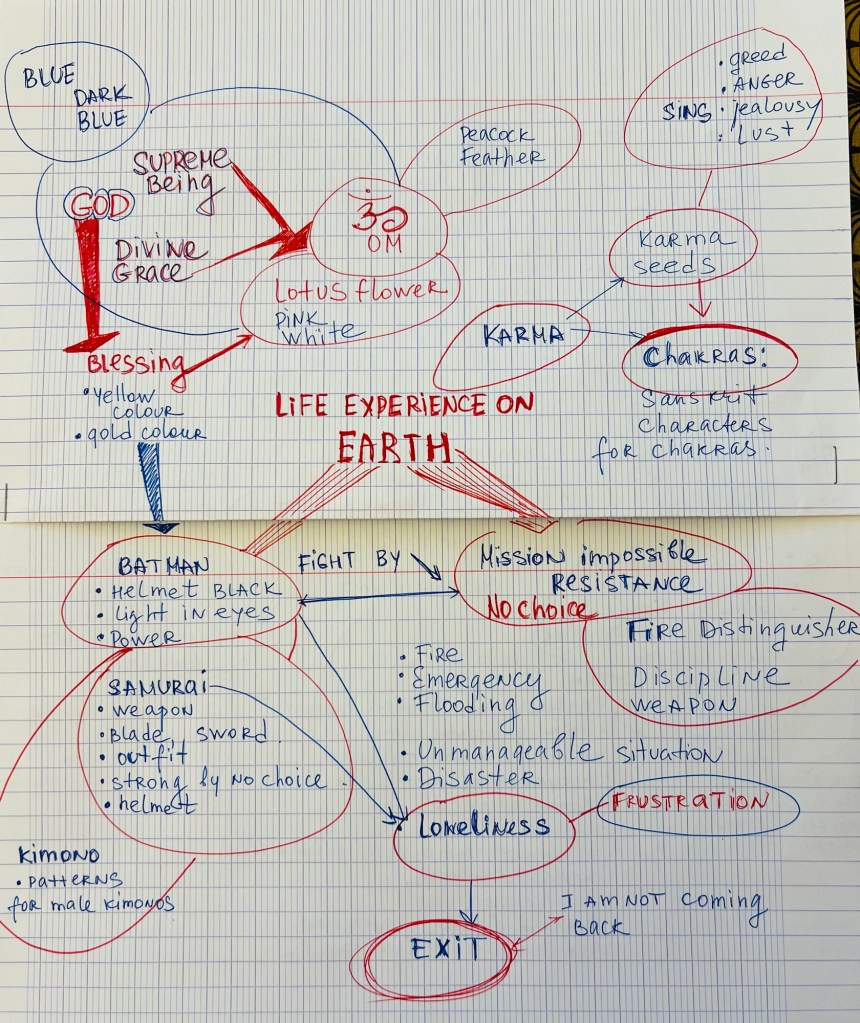 The Mind map about my childhood times and the concept map about Depression is actually one theme; there is a lot of psychology in there. The same comes to my mind map for the “Life Experience” on Earth and the concept map about Reincarnation. The same theory of Reincarnation unites them and is explored from different angles, though having the same structure: Beginning/Arrival – Earth Experience – Exit from cycle /back to Reincarnation cycle, as well as overlapping in the notion of karma and karmic seeds. It is interesting to see that all maps contain information about feelings. In the map for the “Life Experience on Earth”, I develop the Earth experience into psychological states of warriors – the Batman and the Japanese Samurai. I emphasise the feeling of loneliness, which is also present in the concept map about Depression. These Mind Maps ( “The Life Experience on Earth” and “The Childhood”) can not be considered finished. Every branch there should be developed as a search of symbols and visual decisions for the surface of my painting. These mind maps help me understand where I have unfinished gaps and an absence of thinking about certain details; they also help me find a new way to develop the visual outcome. I caught myself in a loose meditative state ( while doing them) of deep immersion into reflection on the past and my memories, writing spontaneously my feelings, colours, and textures I still remember. These associations, memories and feelings are the driving force for the project. Ideally, they should be placed on the wall in the studio and must be completed and filled with photographs, sketches, and texts. They are a powerful tool for creativity and refining my research reflection on what I want to bring to the canvas.