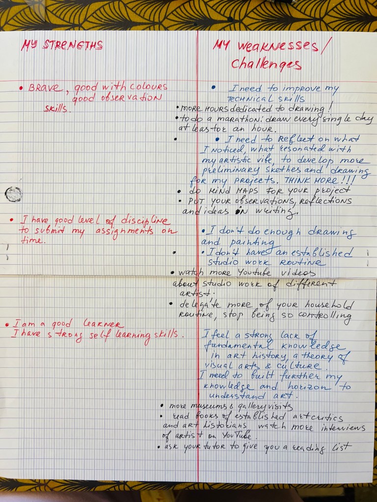 My Challenge: I still need to establish my working routine in my studio. I am disciplined with my studies but must dedicate more time to studio work, engaging with preliminary drawings and experimenting with media.