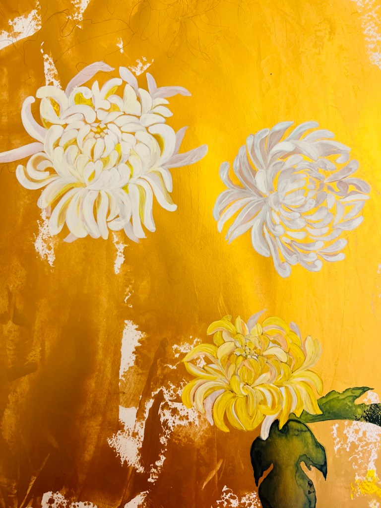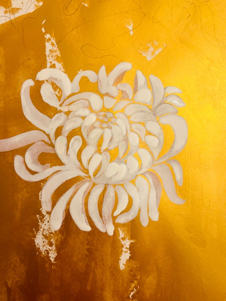 I started developing the Project below in January this year while waiting for the OCA to open my courses for Level 3, so I have included the developmental sketches and drawings in this exercise. This Project is my breakthrough in inventing and mastering my technique to produce my style Chrysanthemum flower and its leaves. I am also sure about the gold background. I made good progress on this Project since I produced an A2 size painting on paper in colours. All flowers are different since I tried different brushstrokes and practised different flower’ bulb shapes. I also experimented with a colour for the leaves, trying shades of green and blue. My plan to develop this Project is to make it in a larger size, either on canvas or on a wooden board, and incorporate poetry of my own or by a poet I will find resonating with my painting. I must decide about the font and its place on the canvas, so the compositional decision is still open. My research is about artworks with poetry. This genre is called “ekphrastic poetry”. There is a Japanese tradition of “tanka” or “haiku” poetry, which is often paired with ink paintings or calligraphy. Thus my research is branched out to “Ekphrastic poetry”: a) I am interested in works of Cy Twombly (1928-2011) who often incorporated fragments of poetry into his abstract paintings. He included quotes from Sappho, Homer, Virgil, Mallarmé, Rilke and Cavafy; b) “haiku” and “tanka” genre; c) Philosophy and poetry about life experience and spirituality;