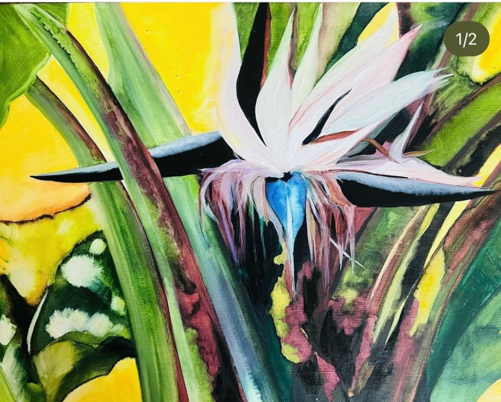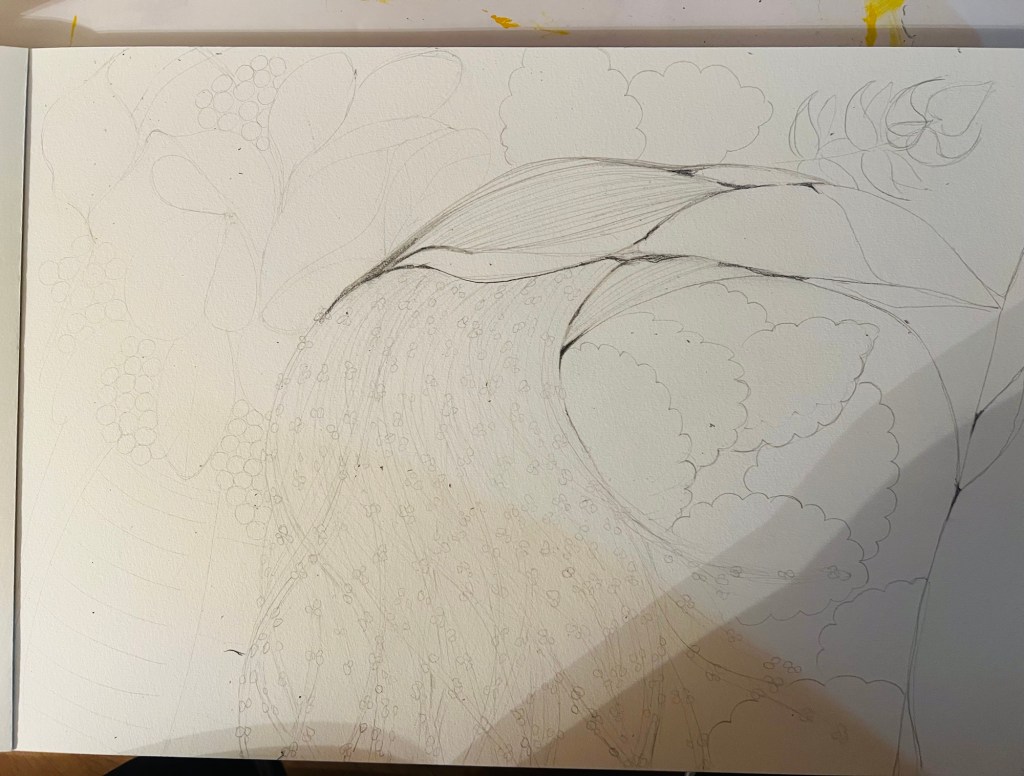 This project will be about the surrounding greenery I observe daily around my location. I started to develop my trial sketches of different fragments, which I will unite on a large canvas. I don’t have any compositional decisions yet because, intuitively, I think the composition will depend on the results of different fragments. I plan to work with acrylics, aquarelle and inks on canvas. Now, I develop sketches on paper; the best outcomes will be included in the large painting. I work on new shapes, textures, colour approaches and techniques for leaves, petals and stems. I develop these projects by taking lots of photographs of the plants, which seem interesting to me, and then I try different ways ( medium and style, colours) to reproduce them on paper. I don’t have a fixed idea of what kind of result I want to get; I just paint and see what comes out, and this is my primary research – I am open to all outcomes. Also, I plan to research composition options and check artworks depicting greenery and plants. As usual, I will use the app to make collages and find the most exciting composition decisions.