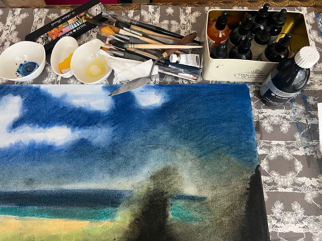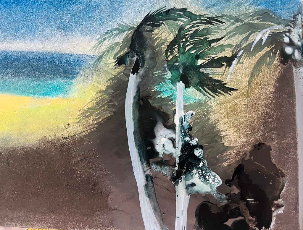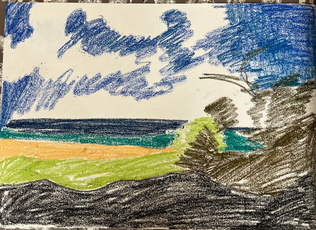After I worked with white pencil, i added colours to the sand, sea and sky areas. After that o worked with a rubber eraser all over the surface. Below is a finished sketch as a prototype for future project.