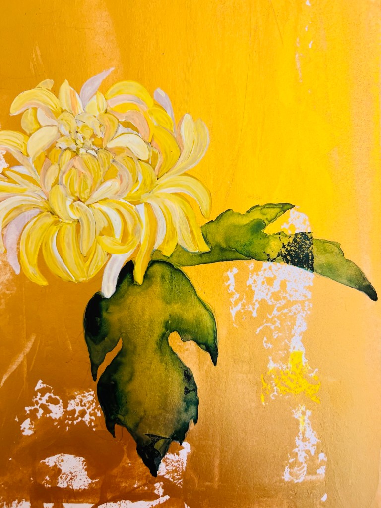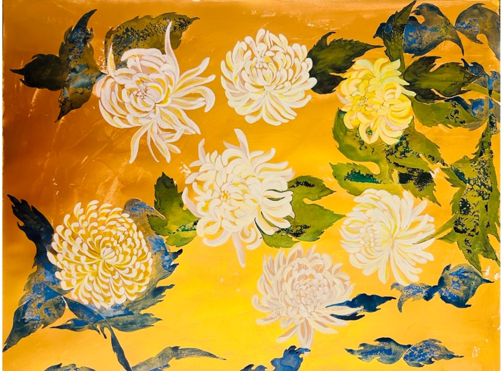 I started developing the Project below in January this year while waiting for the OCA to open my courses for Level 3, so I have included the developmental sketches and drawings in this exercise. This Project is my breakthrough in inventing and mastering my technique to produce my style Chrysanthemum flower and its leaves. I am also sure about the gold background. I made good progress on this Project since I produced an A2 size painting on paper in colours. All flowers are different since I tried different brushstrokes and practised different flower’ bulb shapes. I also experimented with a colour for the leaves, trying shades of green and blue. My plan to develop this Project is to make it in a larger size, either on canvas or on a wooden board, and incorporate poetry of my own or by a poet I will find resonating with my painting. I must decide about the font and its place on the canvas, so the compositional decision is still open. My research is about artworks with poetry. This genre is called “ekphrastic poetry”. There is aJapanese tradition of “tanka” or “haiku” poetry, which is often paired with ink paintings or calligraphy. Thus my research is branched out: a) “Ekphrastic poetry” and examples of it. I am interested in works of Cy Twombly (1928-2011) who often incorporated fragments of poetry into his abstract paintings. He included quotes from Sappho, Homer, Virgil, Mallarmé, Rilke and Cavafy; b) “haiku” and “tanka” genre; c) Philosophy and poetry about life experience and spirituality;