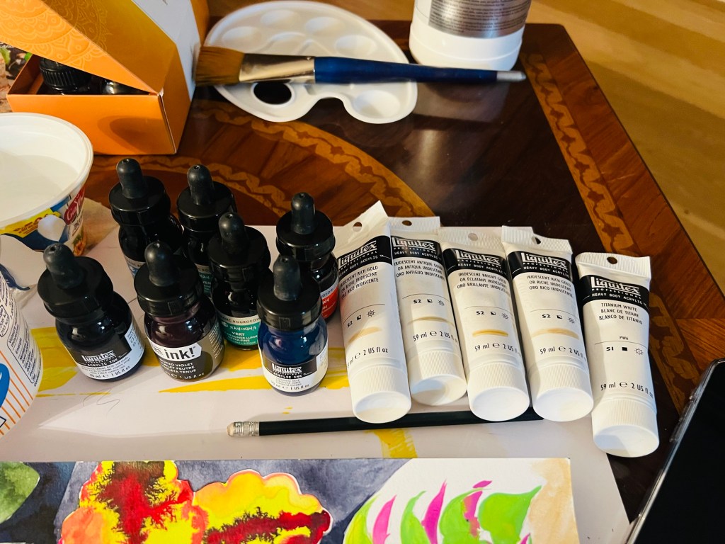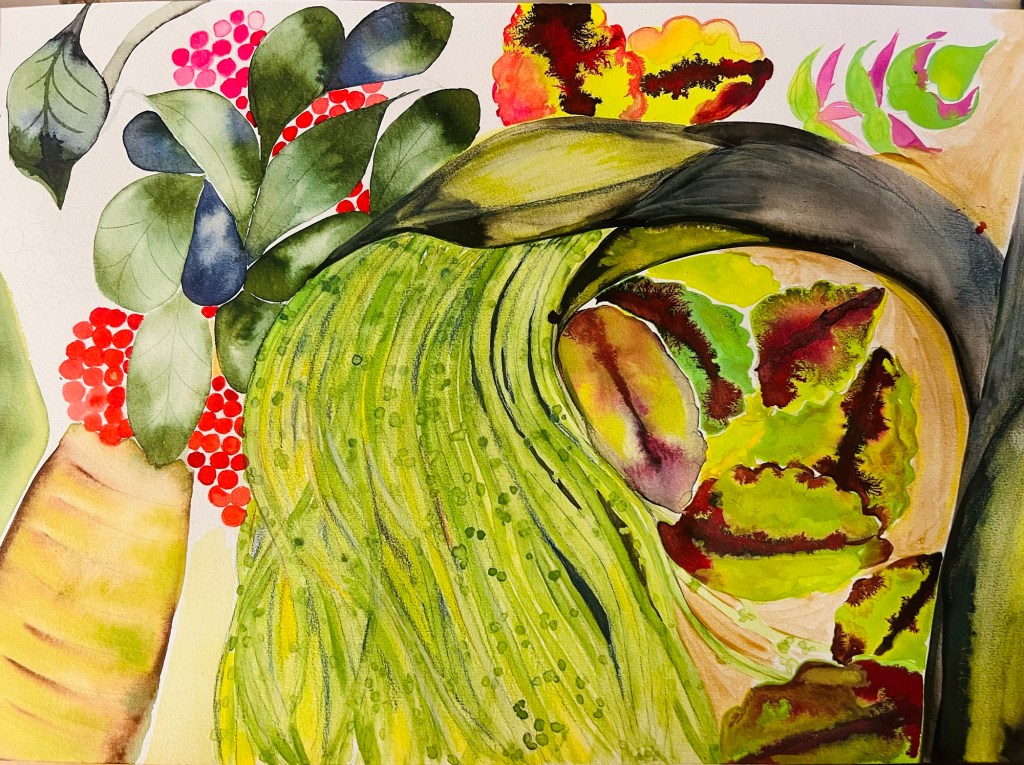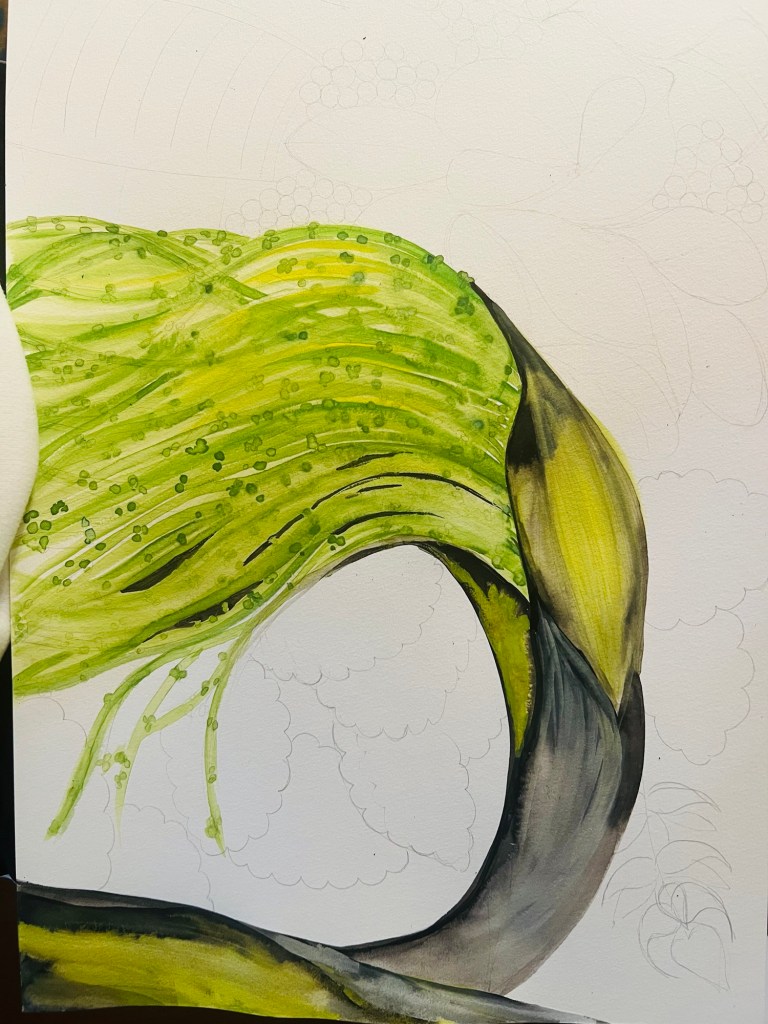This project will be about the surrounding greenery I observe daily around my location. I started to develop my trial sketches of different fragments, which I will unite on a large canvas. I don’t have any compositional decisions yet because, intuitively, I think the composition will depend on the results of different fragments. I plan to work with acrylics, aquarelle and inks on canvas. Now, I develop sketches on paper; the best outcomes will be included in the large painting. I work on new shapes, textures, colour approaches and techniques for leaves, petals and stems. I develop these projects by taking lots of photographs of the plants, which seem interesting to me, and then I try different ways ( medium and style, colours) to reproduce them on paper. I don’t have a fixed idea of what kind of result I want to get; I just paint and see what comes out, and this is my primary research – I am open to all outcomes. Also, I plan to research composition options and check artworks depicting greenery and plants. As usual, I will use the app to make collages and find the most exciting composition decisions.