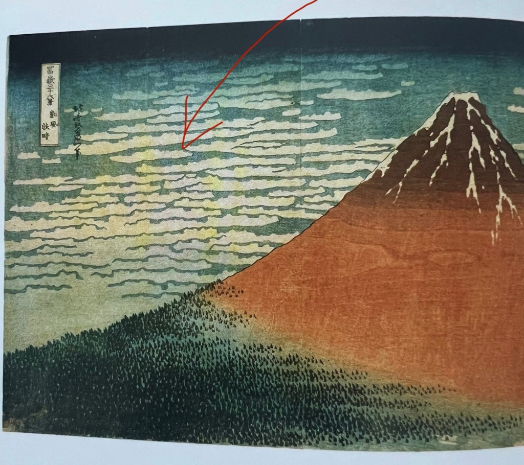Below I place new artworks of Hokusai I discovered via research on painting clouds and mist. They are marked by me with red arrows.
