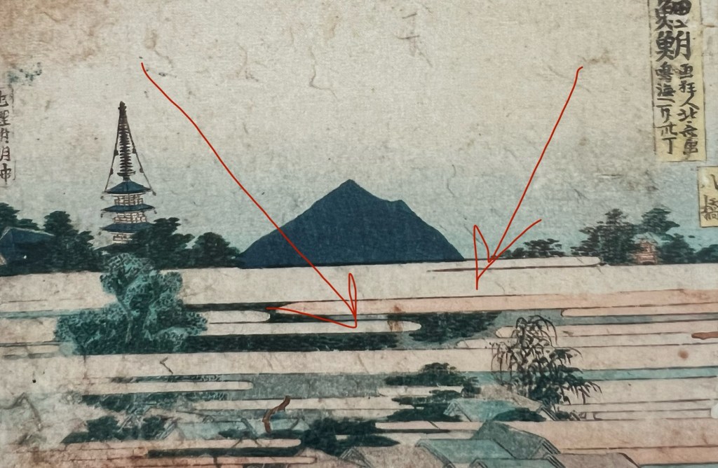 A Bridge in Edo, rom the series 36 views of Mount Fuji, 1830-34, fragment, coloured wood, image via “Hokusai” book by Olaf Mextorf, p. 9, @Edition Place des Victories, Paris, @ 2017 Könemann;