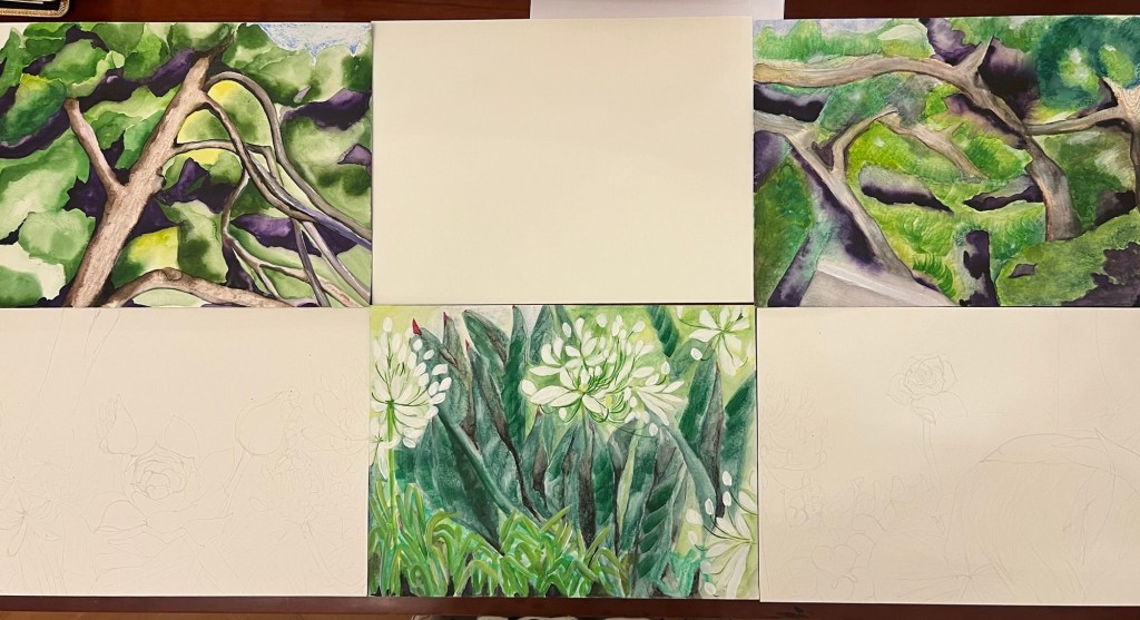 I liked the approach of David Hockney in his painting. I did earlier research on ” A Closer Winter Tunnel” and a “Late Spring Tunnel’ 2006, oil on six canvases. Below is my work, where I borrowed his paintings by individual blocks on one of six canvases. Here, I make a trial of my first compositional decision for the project. I placed the trees’ crown pieces and pencilled in the flowers I had worked on earlier.