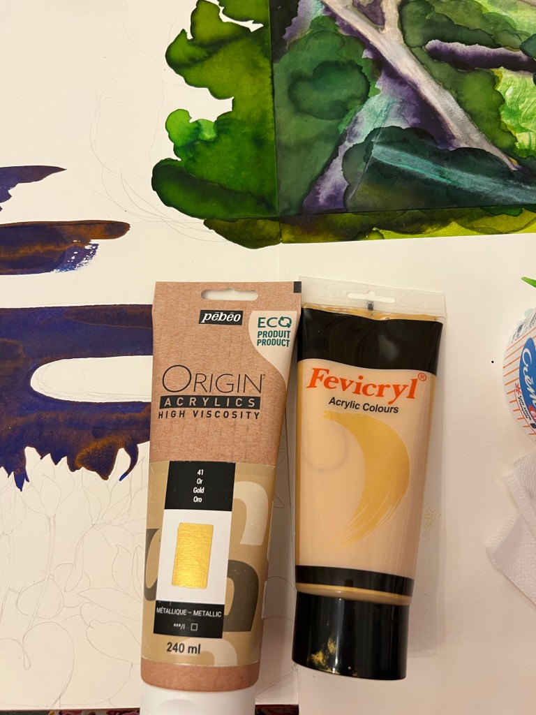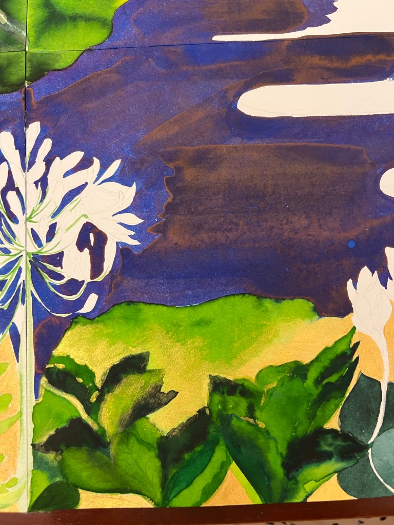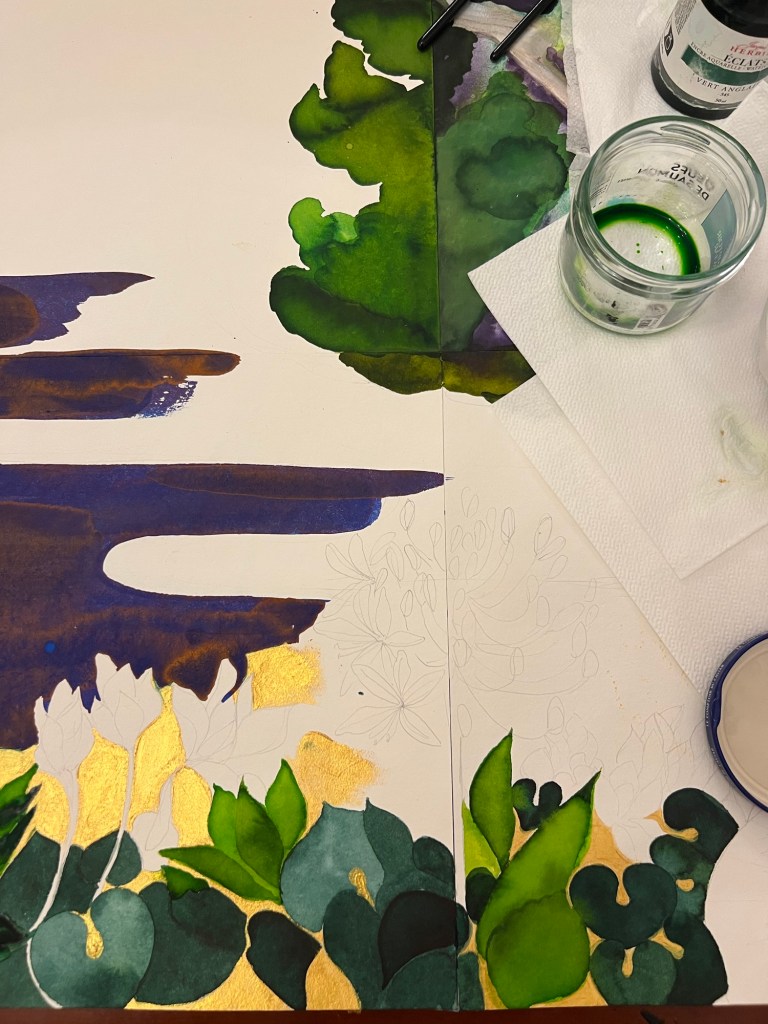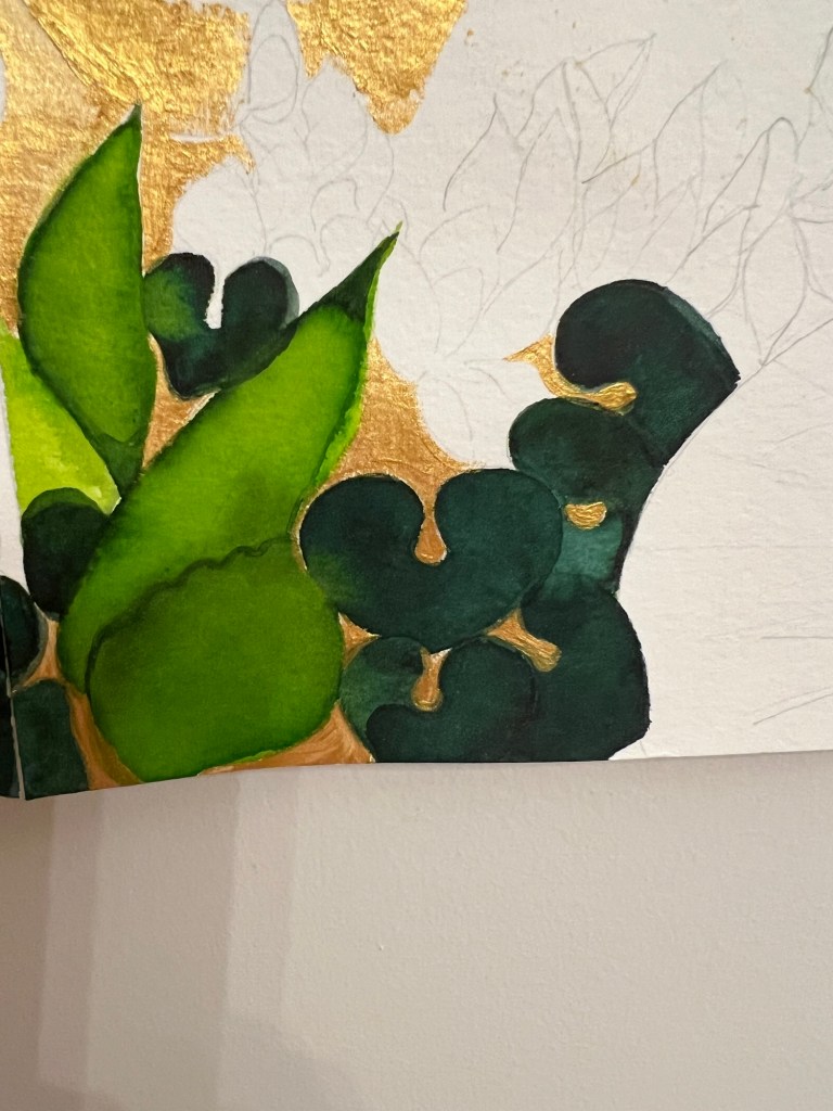 Below is my analysis of the details of the composition. The left sheet – the green leaves I don’t like; this is how I should not depict them. When I realised I should try something different, I developed different leaves – below in the middle, the round, heart-shaped leaves in dark green- I combined them with a gold background. So I think they will stay and I will develop them further. I think the flowers on the sheet on the right side are good and will remain for larger painting as an element.
