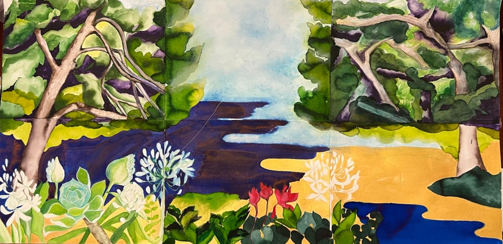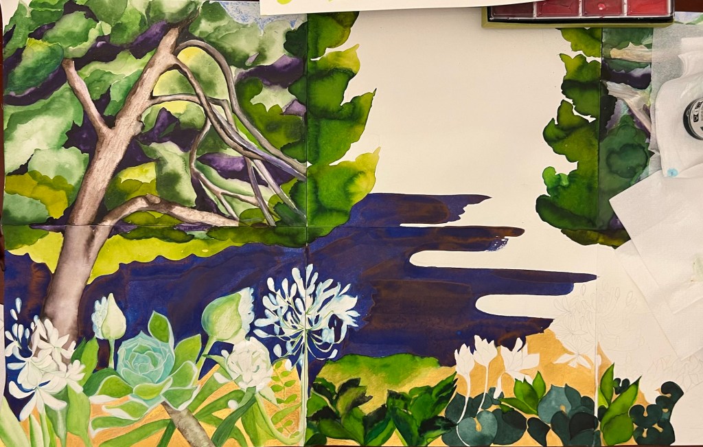 In Part Three, I developed three panels—sheets with different trees in inks and soft pastels. In Part Four, I continued working with them as fragments of my larger painting. I had to work on empty parts, so I started developing the bottom part of the painting.