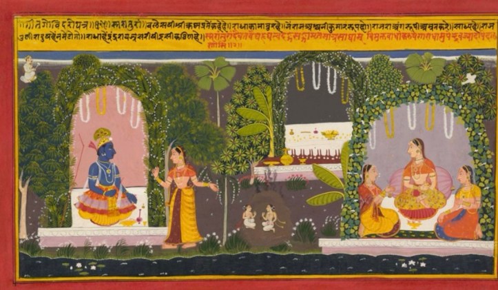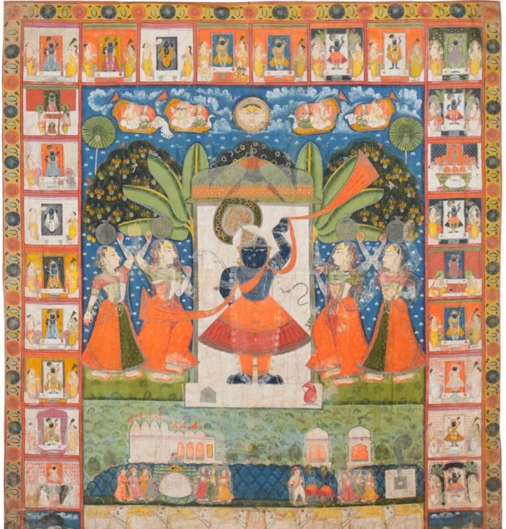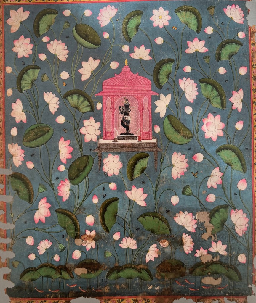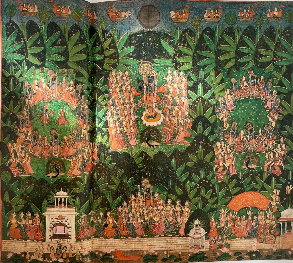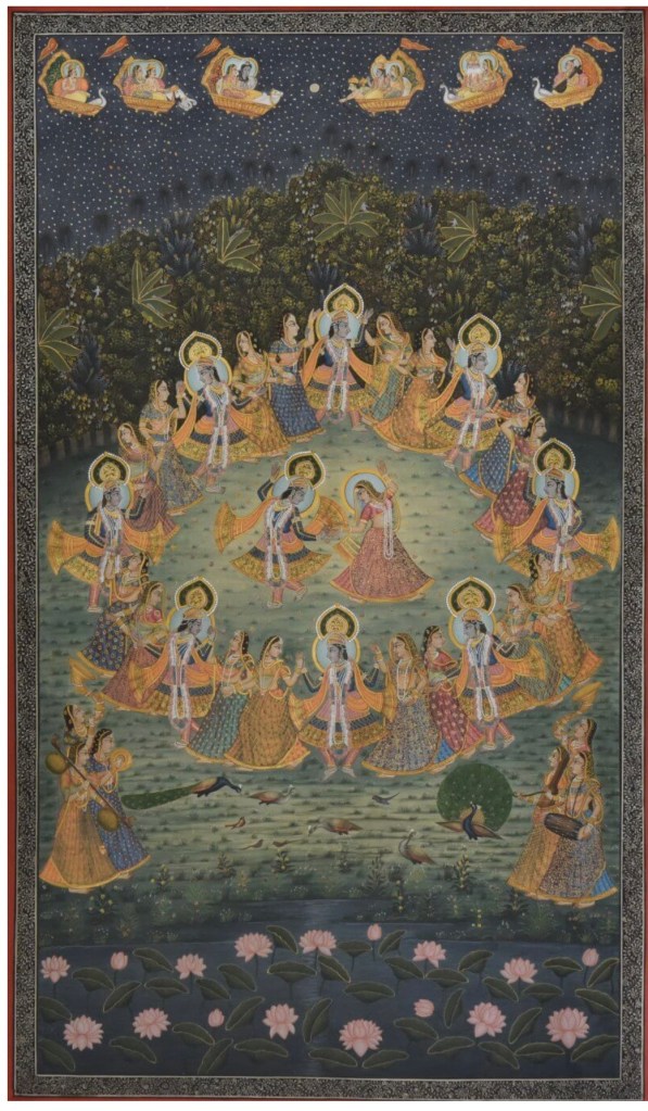 Illustration 1. The Union and Separation of the Hindu God Krishna and Radha, from a Song of Govind (Gita Govinda) manuscript, Artist unknown, opaque watercolour, and gold on paper, 21.4*38.5 cm, period: Mughal dynasty (1526-1857), image via Asian Art Collection, Yale University Art Gallery, online on https://lux.collections.yale.edu/view/object/1882fa52-5035-4939-beac-bc751cb89d58 [accessed on July 30th 2024];Illustration 6. Pichwai of Rasleela for Sharad Purnima, Artist unknown, c.1900, from the collection of Museum of Art & Photography, image via online on https://umaid.art/2022/08/06/pichwai-paintings-of-rajasthan/ [accessed on July 30th 2024];Illustration 7.Pichwai of Daan Leela, Unknown Artist, c.1900, from the collection of Museum of Art & Photography online on https://umaid.art/2022/08/06/pichwai-paintings-of-rajasthan/ [accessed on July 30th 2024];Illustration 2. Krishna Fluting for the Gopies, Artist unknown, Jodhpur, India, late 18th century or early 19th century, opaque watercolour, gold and tin alloy on paper; 65*49.2 cm, the Art Institute of Chicago; image from “Gates of the Lord. The Traditions of Krishna Paintings” 2015, p.70Illustration 8. Raas Lila, Artist unknown, Nathdwara, Rajasthan, India, Late 19th century; opaque watercolour on cotton 243*286.5 cm. Arthur M. Sackler Gallery; image from “Gates of the Lord. The Traditions of Krishna Paintings” 2015, p.118Illustration 3. Lila on the Ghats, Artist unknown, Nathdwara, Rajasthan, India, mid-18th century; opaque watercolour heightened with gold paper, 25.7*35 cm, Amit Amabal Collection, image from “Gates of the Lord. The Traditions of Krishna Paintings” 2015, p.99Illustration 4. Vrikshachari Pichvai, Artist unknown, Hyderabad, Telangana, India, late 18th century; opaque watercolour and gold on cotton 70.2*161.1 cm Collection of Thomas and Margot Pritzker, Chicago, IL; image from “Gates of the Lord. The Traditions of Krishna Paintings” 2015, p.107Illustration 5. Kamalan Ki Pichvai, Nathdwara, Rajasthan, India, artist unknown, early 20th century, cotton painted with pigments 178*154.4 cm; image from image from “Gates of the Lord. The Traditions of Krishna Paintings”*, 2015, p.98
