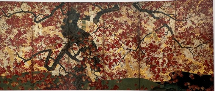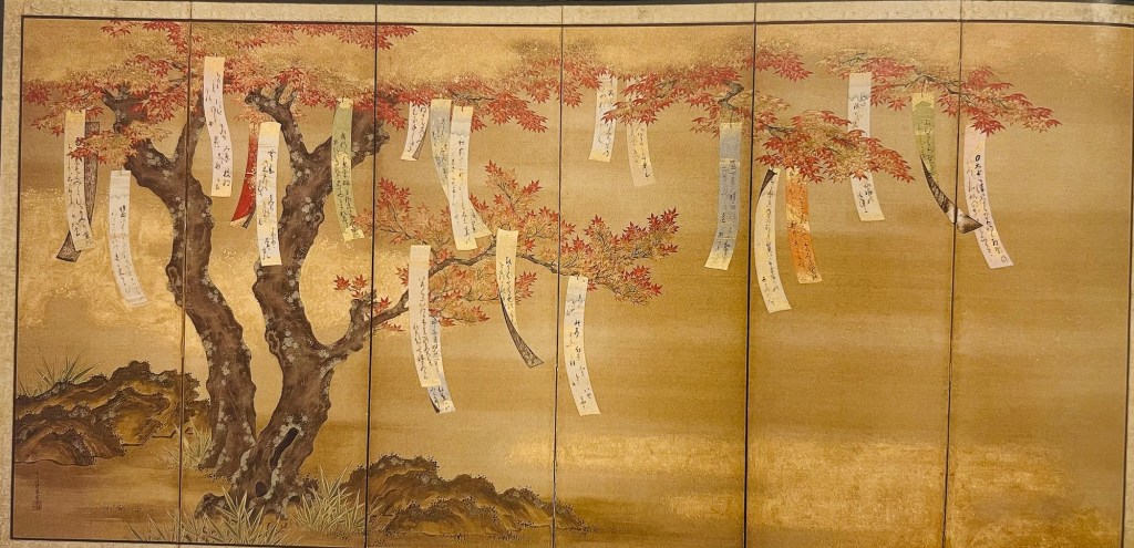 Illustration 12.Below: Flowering Cherry and Autumn Maples with Poem Slips, Tosa Mitsuoki, 1654/81, Pair of sox-panel screens; ink, colour, gold and silver on silk; each 144*286 cm. the Art Institute of Chicago. Kate S. Buckingham Endowment; image from “Beyond Golden Clouds. Japanese Screens from The Art Institute of Chicago and the Saint Louis Art Museum”, 2009, p. 132-133;