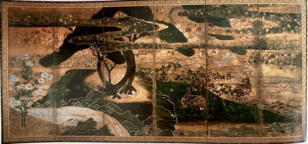 Illustration 13. Below and above: Birds and Flowers of Spring and Autumn, Tosa Mitsouki, Japan, 17th century; pair of six-panel screens: ink, colour and gold on paper, each 157*367 cm. Egawa Museum of Art, Hyogo, Japan. Image from the “Beyond Golden Clouds. Japanese Screens from The Art Institute of Chicago and the Saint Louis Art Museum”, 2009, p. 42
