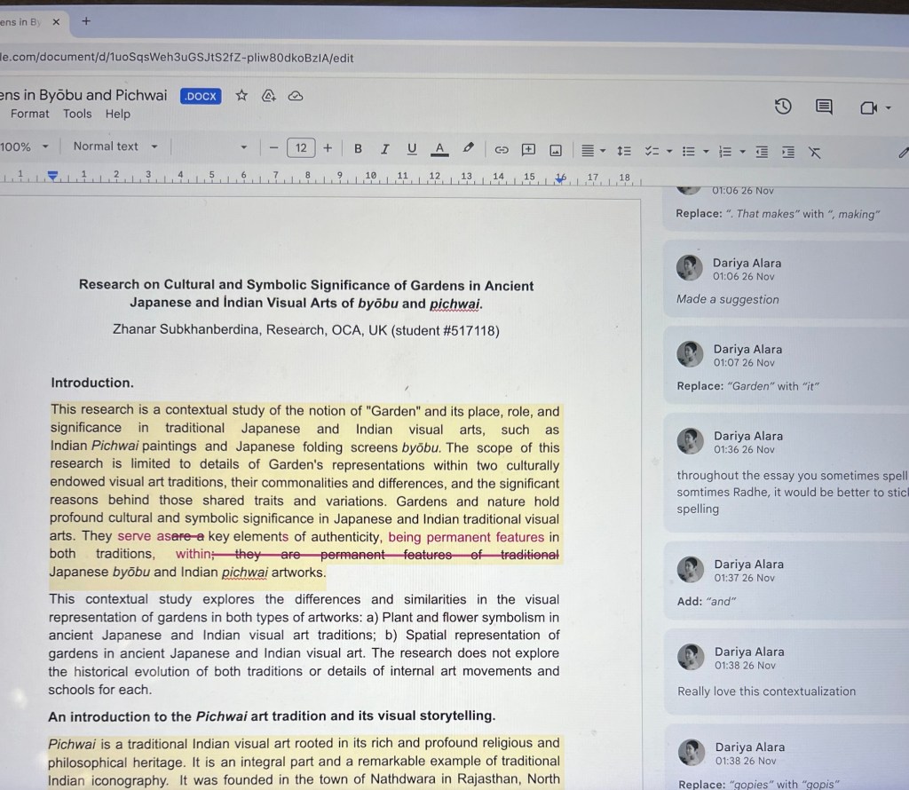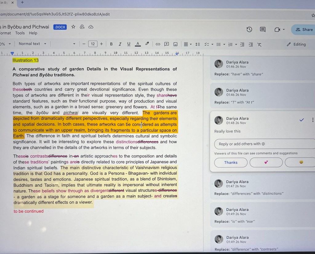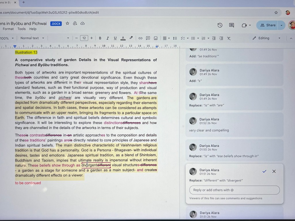 That was my last tutor’s feedback for this course assignment – a written element – my research paper “Cultural and Symbolic Significance of Gardens in Traditional Japanese byōbu and Indian pichwai Visual Arts“. Dr Halcrow was happy with my progress and didn’t suggest any changes in terms of the textual structure of my study, nor did she find my conclusions weak and unsupported by my arguments or not interesting and irrelevant. Below is a summary of her advice to improve the final quality of my written work, I put in quotes: