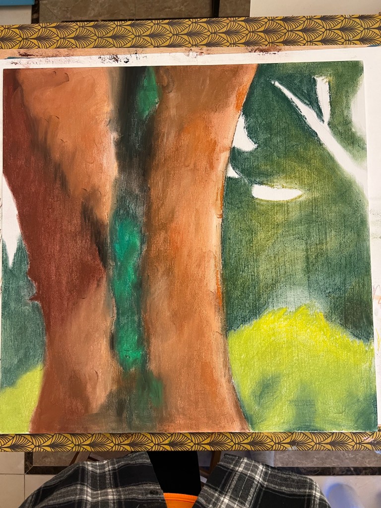 Today I spent an hour in my other creative space – the space, adjacent to my kitchen. I worked with soft pastels, thinking about the tree’s stem and bark, which is an important part of the composition. Below is my quick, unfinished study. I came to work after lunch because my mornings are busy with all sorts of tasks I have in my daily family routine. These tasks distract me from the creative process, so I try to do them in the morning to empty my head of them.