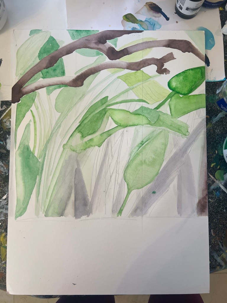 Today, I started preparing materials for my next project related to the Garden theme I am developing. I have made a study on paper to reflect on the compositional decision. I have applied a gesso over one of the three wooden boards I plan to use for the work. I worked after lunch for one hour in my studio. I also check the new aquarelles in small tubes I bought recently. I checked the quality and colours of the paper study and decided to stick to inks for my project on wooden boards.