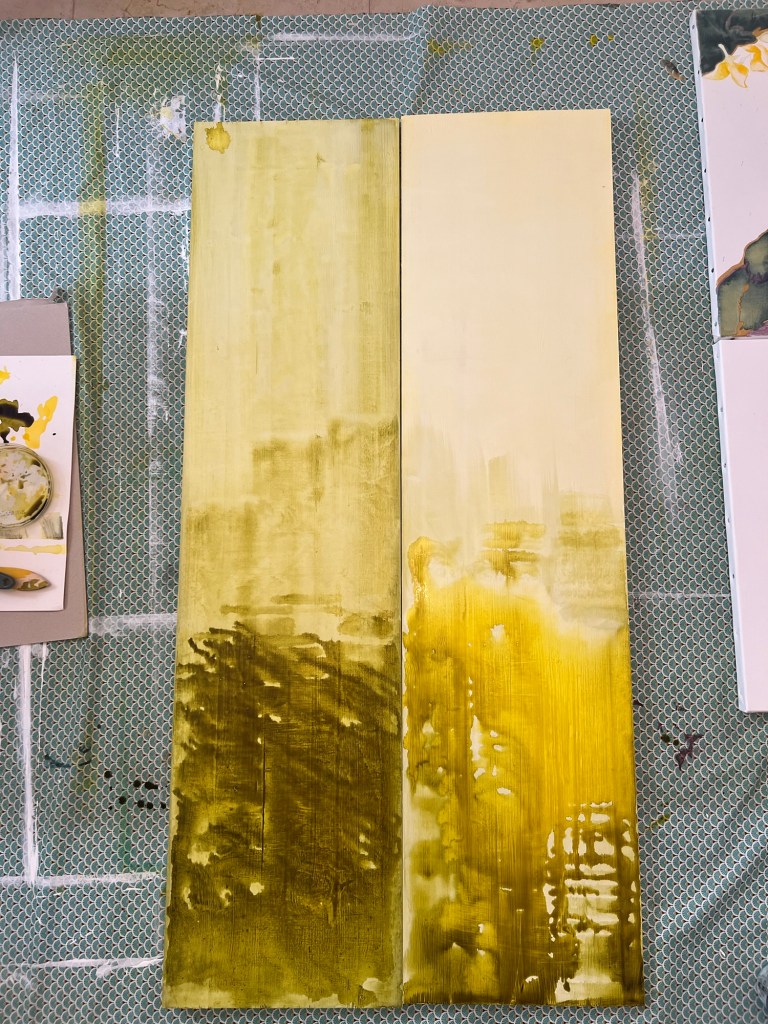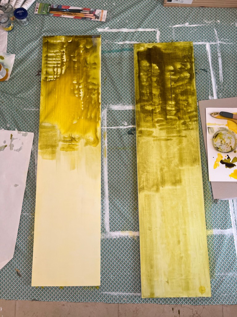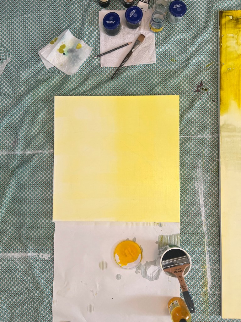 Today I worked for an hour creating a background to continue with one item of my Garden project, which I started on 6 separate canvases earlier. I have been thinking about this project, and didn’t continue because I was unsure about the background colour. After I tested the bright yellow on the wooden board for different projects, I realised I wanted the same hue for the canvas fragment. Working on two projects simultaneously stimulates my creativity, helping me find solutions for postponed ones.