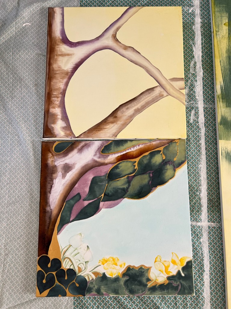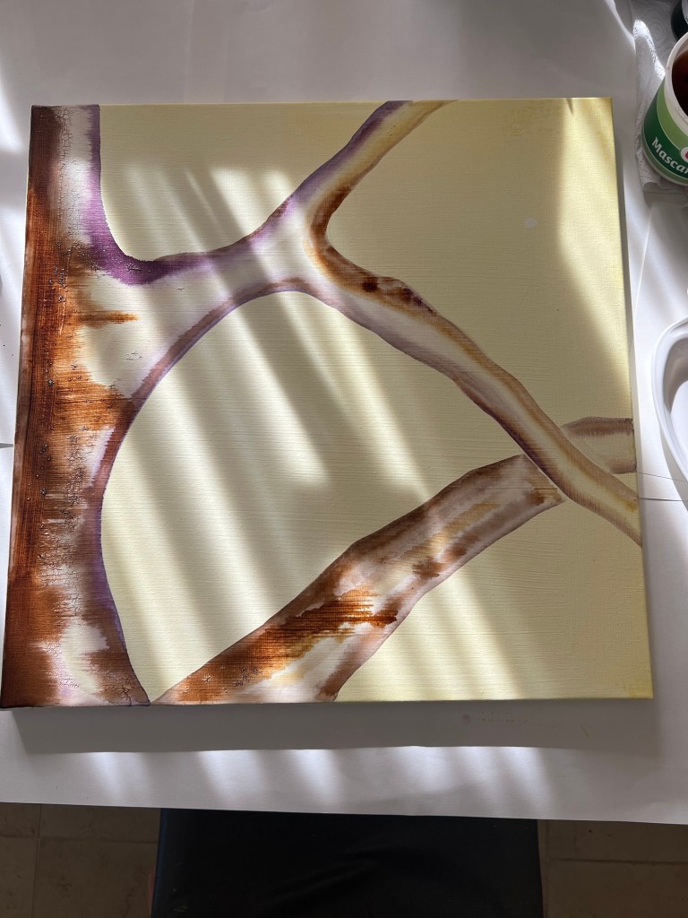 After lunch, I spent an hour working on one of the canvas fragments. I placed the previous one to continue the tree. I like this project because I don’t know where it will take me. I am developing one side of the 6 canvases containing work, and I have no idea where I will end up and with what. This is very exciting and makes me feel happy.