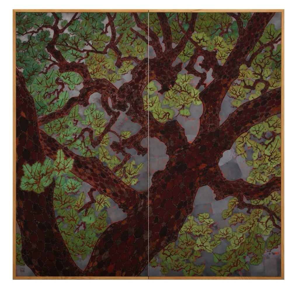 Daisuke Nakano is one of the best representatives of the Nihonga art movement, a heir to traditional Japanese visual arts. I have been heavily influenced by traditional Japanese visual arts, and my works are very much inclined toward their visual language and overall mood and aesthetics. I placed the painting above because it illustrates our common interest in the subject: I also paint trees’ stems and foliage. As a main character in the story unfolding on the canvas, the tree’s stem is dear to my heart. The tree’s stem has been one of the key elements of the Japanese visual art tradition, including the Kano, the Rinpa school, the byōbu, and yamato-e.