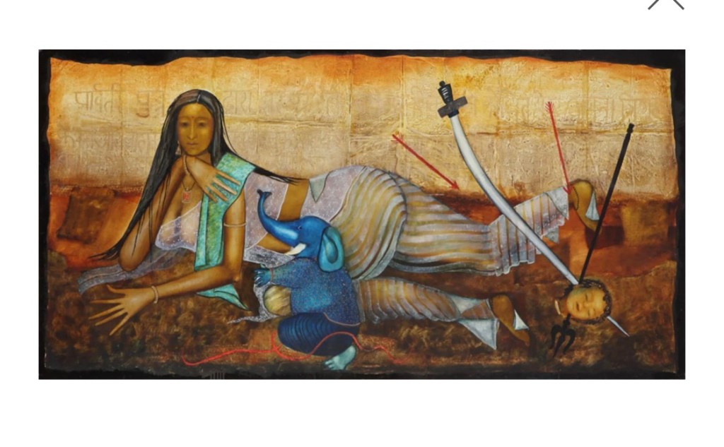 Above: Anjolie Ela Menon, Divine Mothers series-I (Parvati), 2014, oil on mason, 48.5*96.5 in, image via http://www.vadehraart.com [accessed on May 8th, 2025]