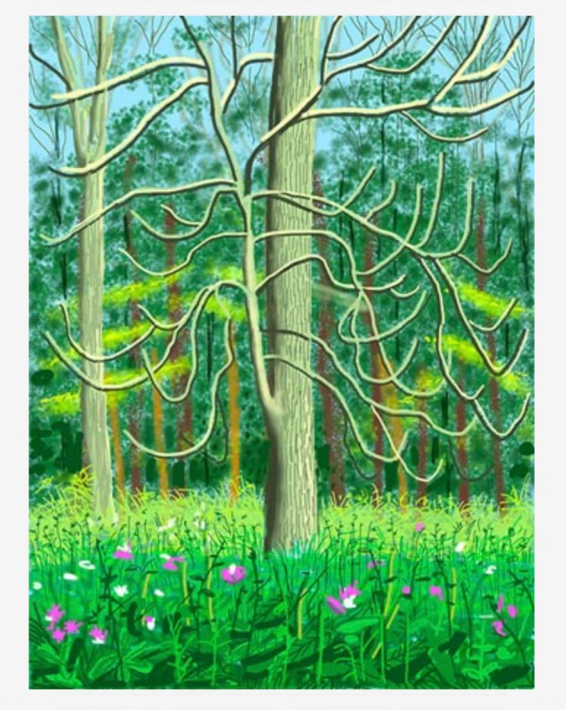 Below: David Hockney, The Arrival of Spring in Colgate, East Yorkshire in 2011 ( twenty eleven)-4 May, 2011 -IPad drawing printed on paper 55*41 1/2 inches; image via http://www.hockney.com [accessed May 3, 2025];