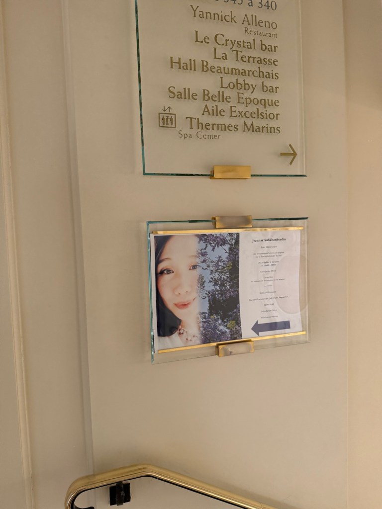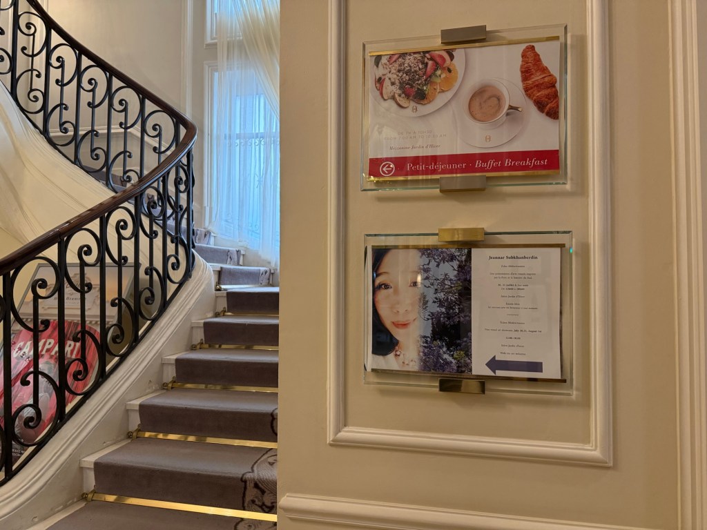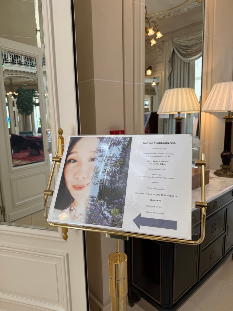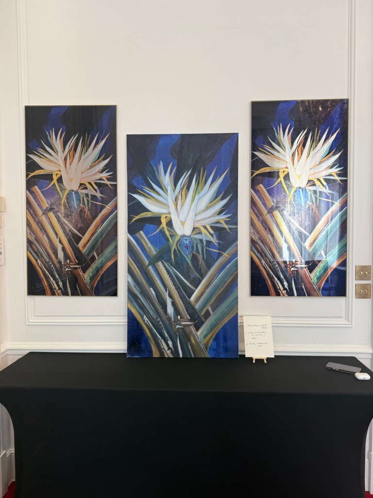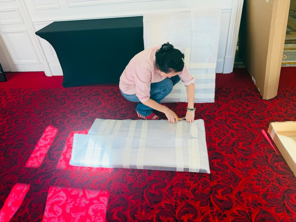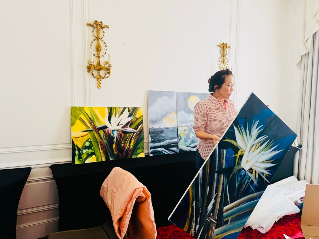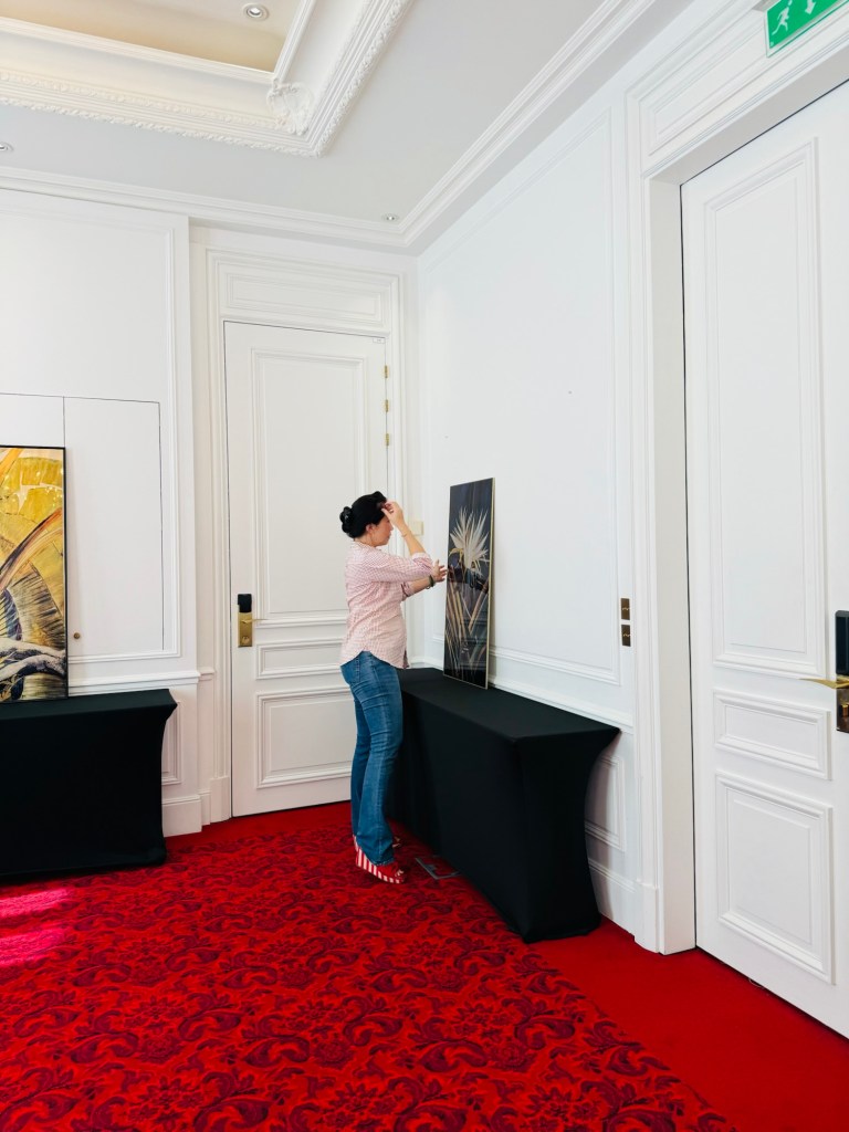 I had to move many black stands to the centre to align them between the lights and along the walls. I needed to create some space between the black stands so my works can breathe and occupy their own area. It was indeed crucial. It took about two hours of rearranging the works until every piece found its place in the room. Removing the hotel’s art pieces was also a good decision, as I used the hooks for my own pieces. The thing which struck me most is how different your art looks and feels as soon as you take it from your studio and place it in a different environment. The strong, in my opinion, pieces looked more humble, and those which I thought were not that interesting looked more confident than in the studio. I placed the yellow-white peony print on two black stands, as I didn’t have a wall space to accommodate them. The black-coloured fabric worked well as the display surface. Even though these decisions came out of wall display space scarcity, it was perceived by the public as creative and many people said that placing it this way was an excellent idea and they would put it like this at home as well. There was one ugly and very noticeable hook left after the hotel’s artwork, and I covered it with one panel of the yellow-white peonies metal print.