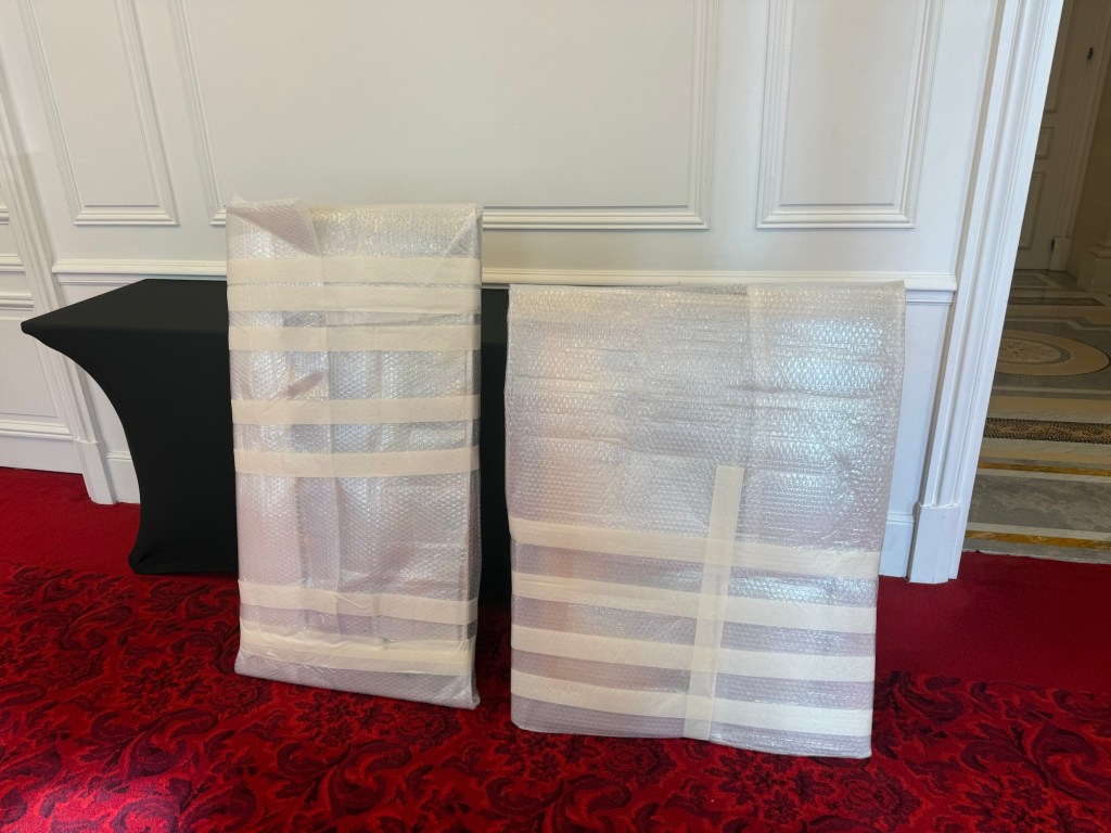 When I arrived and started to unpack, I realised that two hotel pieces (marked on the photos below with a yellow line) cannot stay and must be removed; otherwise, they really ruin my show :)). The hotel staff was very professional and didn’t say “no” to me. When the pieces were removed, the space became more open and improved. It was so clear that inappropriate art, when removed, gives the room back its potential.