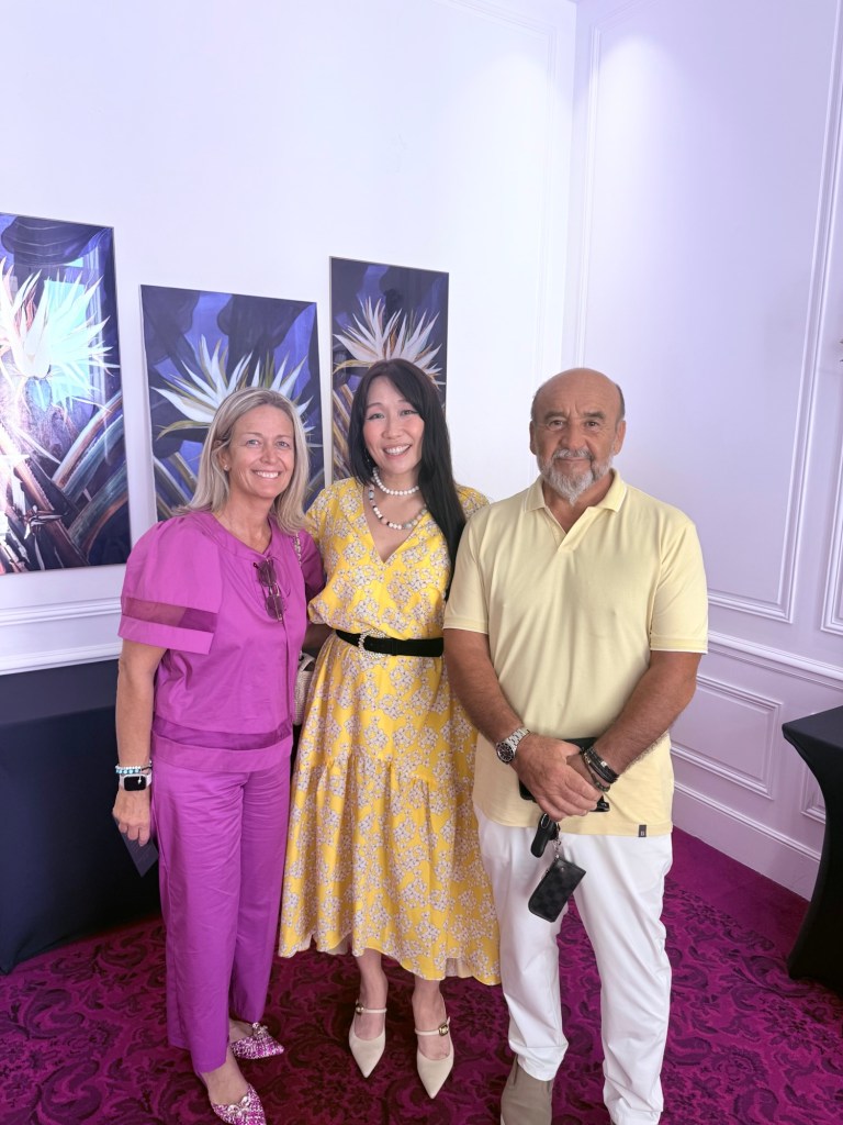 Last night, after I got back home and sleeplessly reflected on my first day, I decided to rearrange how I display some of the artworks, and that was the first thing I did this morning. It was a strange, mixed feeling of detachment and curiosity —leaving the items in the venue, then coming back the next day to see them again. You come the next day, and they meet you in the room, where you see which ones have settled well and which haven’t. So, I changed the dark blue “Sterlizia Night Bloom” trio (an original work on canvas and a pair of metallic prints) to a different corner, which had better light, and the wall part’s size was larger than in the previous corner, so it accommodated them better. That was an adaptation of my work in the venue’s space. Most adaptation was about finding the best place for each piece, adapting their sizes to the available wall dimensions and the light in the room. The showroom had large windows facing East, South, and some of the West, mainly East and West. The sun was moving from one corner of the room during her, giving “individual attention ” to South, so the day to an attention with its light to each piece. Each piece had different lighting during the show time, 12 pm -6pm, and I didn’t need any electric lights. From a daylight quality standpoint, the venue was just perfect.