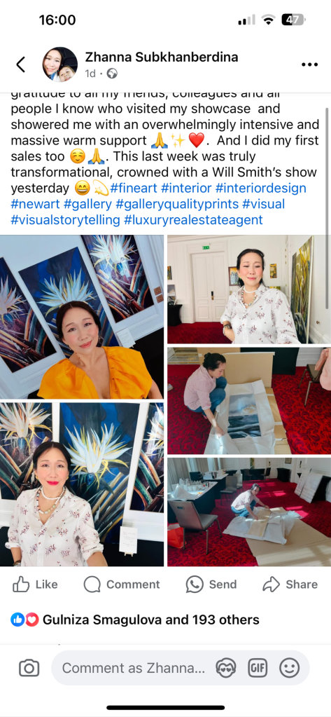 I have been using Facebook, Instagram, and LinkedIn so far. I have been posting my artworks on Facebook and Instagram for the past three years, intentionally transforming and using them as a platform for my artist blog. I don’t post any other content on my Instagram page; however, I can write about topics different from art on my Facebook page. LinkedIn has always been free from art themes and is devoted to my other professional pursuits, such as business consulting and board work. I don’t use TikTok and Threads, maybe yet. I think things will stay like that. With my experience in social media and observation of what others in the visual art field do, I have come to the conclusion that I don’t want to sell via social media platforms at this point. Every time I see a rising artist’s advertising on Instagram or Facebook about the holiday time 30% discount – it looks desperate and kind of puts them in the “struggling artist” category. Instagram is ideal for showcasing, sending invitations, and promoting overall publicity for professional visual artists, but I would not recommend using it as a primary sales tool for artworks. You can be very successful on Instagram selling pots and pans, bijoux and clothes, but not the artwork, and I am even more convinced of that after I had my first artwork sales experience via my exhibition.